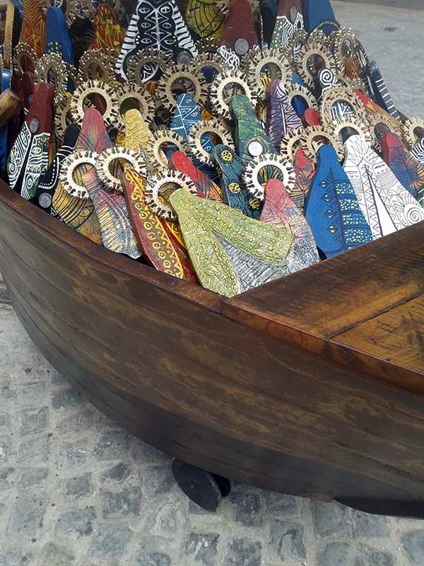La obra Virgen que llegas por aguas está conformada no solo por la embarcación, sino además por unas 300 imágenes, con las siluetas de vírgenes católicas, decoradas por Sancho y sus colaboradores (hasta algunos niños). Las imágenes reproducen los colores de Yemayá, Ochún, Oyá, Obbatalá y otras deidades femeninas del mundo de los orishas; también las texturas alcanzadas son de gran actualidad y belleza.