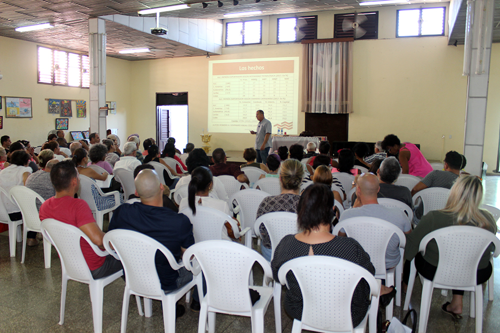 Un auditorio de más de sesenta personas, entre ellas cuentapropistas, integrantes de grupos gestores comunitarios, representantes de varios organismos del territorio cardenense, profesores, músicos, médicos, amas de casa y trabajadores de nuestra Institución, escucharon, con ávido interés, la conferencia magistral que sobre crecimiento, desarrollo e instituciones que impartió, en el Salón Central del CCRD-C, el Dr. en Ciencias Económicas Juan Triana Cordoví, profesor de la Universidad de La Habana e Investigador del Centro de Estudios de la Economía de Cuba.