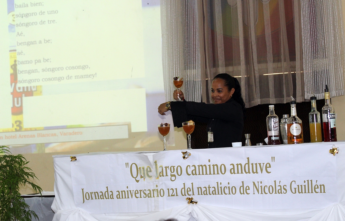 El canto y el baile popular sirvieron como un segmento intermedio para dar entrada al segundo momento de este encuentro, el cual fue sui generis y agradecido por el público asistente: el concurso de coctelería “Te voy a beber de un trago”. Los cantineros competidores se inspiraron, para la creación de sus cocteles, en obras de Guillén, que debían defender frente al jurado y al público. En líquidos de base etílica -paladeables y agradables- cobraron forma la poesía mulata y popular de Motivos del son y Sóngoro cosongo, la transculturación expresa del poema “Dos abuelos” y su carga racial que aún pesa sobre nosotros, el verde de esos dos amigos Sapito y Sapón, lo bueno y malo de “La muralla” y hasta la intensidad caribeña que se expresa en Isla de rojo coral.