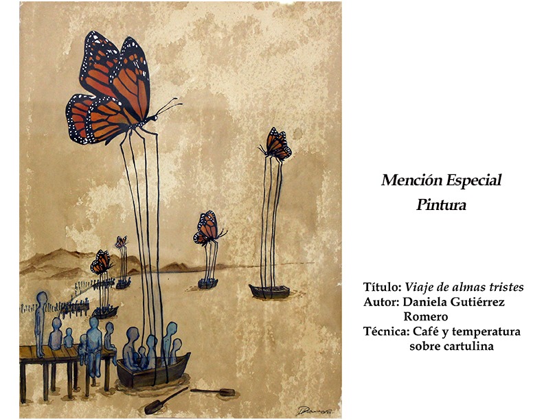 Mención Especial a Daniela Gutiérrez Romero, por la obra Viaje de almas tristes. Por la belleza y delicadeza en el uso de los recursos técnicos y por su creatividad. Por el mensaje sensible y humano que su obra plasma, y el excelente resultado de diseño logrado en ella.