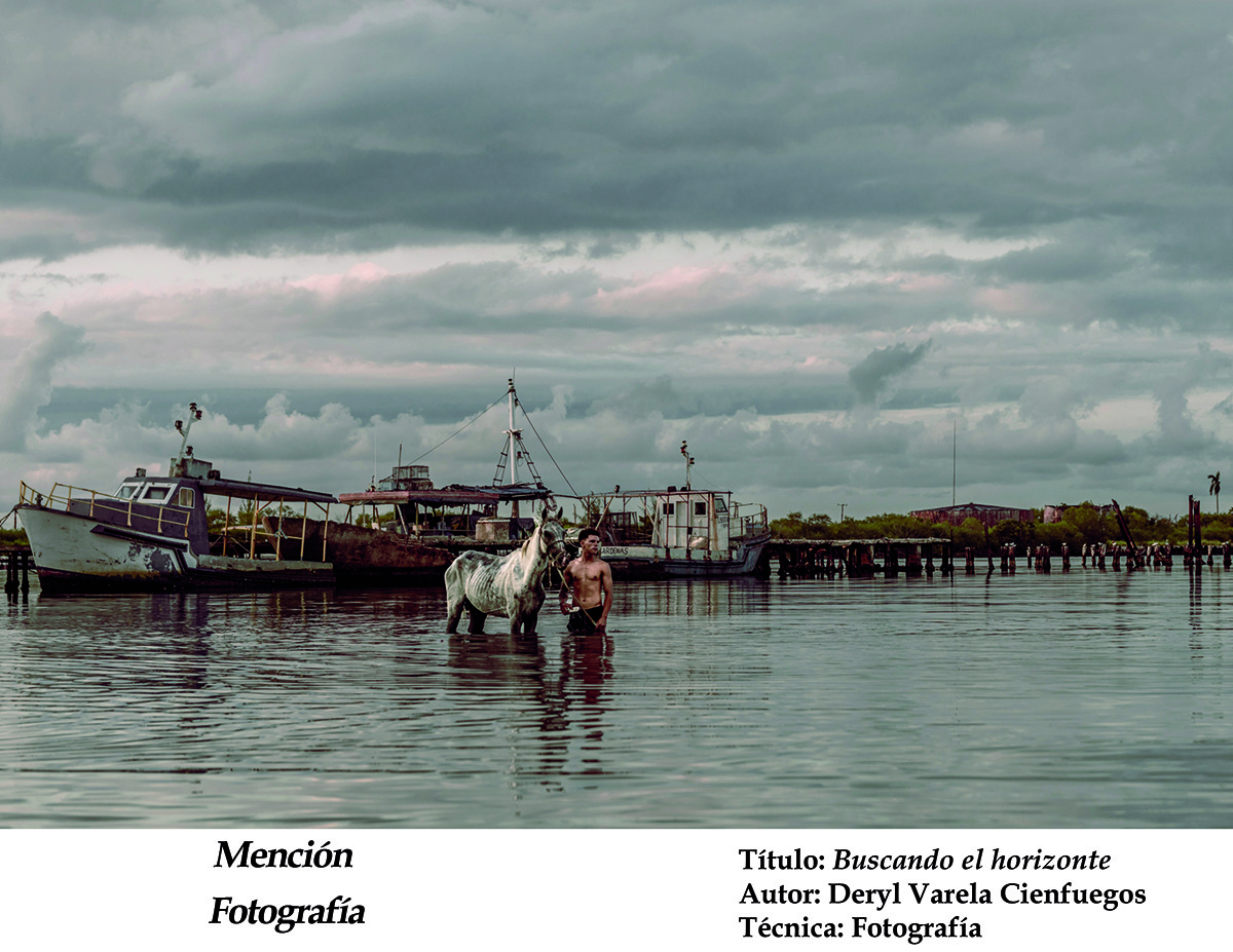 Mención a Deryl Varela Cienfuegos, por la obra Buscando el horizonte. Por el uso de símbolos locales identitarios y la excelente composición gráfica lograda para obtener una obra signada por preguntas y expectativas, en un ambiente de absoluta incertidumbre y lazos conectivos con sus raíces.