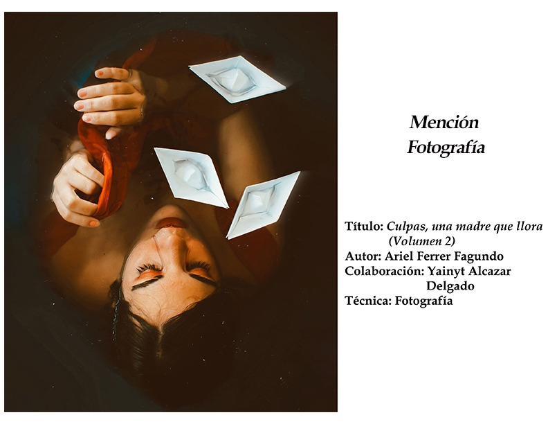Mención a Ariel Ferrer Fagundo y Yainyt Alcazar Delgado, por la obra Culpas de una madre que llora (volumen II). Por el espectacular uso del color, que actúa como eje y catalizador de la obra, el mensaje desgarrado y de incógnitas, vuelos ante la pérdida y separación involuntaria de una o más partes; y por el uso magistral de los espacios líquidos como espejo y destino final de sentimientos.